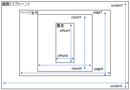 | pageY | イベントが発生した際のマウスのY座標を、ドキュメント全体を基準にして取得する |