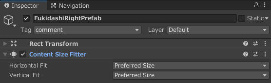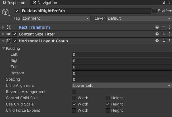 画像が横に並ぶように”FukidashiRightPrefab”には、”Content Size Filter”と”Horizontal Layout Group”を追加してサイズの自動調整と配下の部品が横に並ぶように設定しています。(このあたり試行錯誤でうまくいったので詳細はあまり理解できていません。)