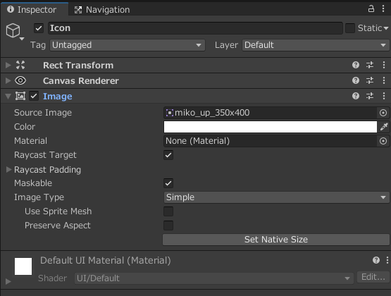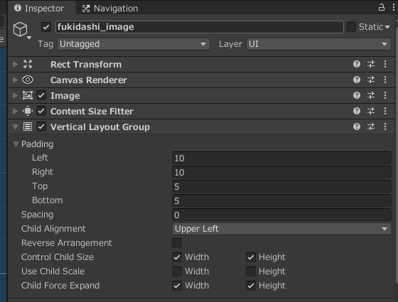 吹き出し画像にも”Content Size Filter”と”Vertical Layout Group”を設定しています。