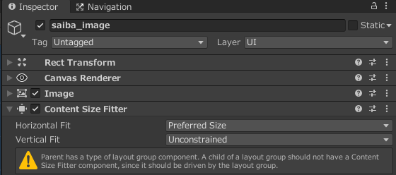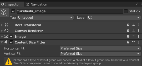 また、文字数によって、自動で範囲が広がるように背景画像と吹き出し画像には”Horizontal Layout Group”とContetnt Size Filter”を設定します。