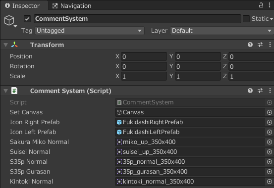 SetCanvas: コメントを表示するキャンバスを指定します。このキャンバスの中に、コメントとキャラクターのアイコンが表示されます。IconRightPrefab: キャラクターアイコンが右側に配置されたコメントのプレハブを指定します。(詳細は後述)IconLeftPrefab: キャラクターアイコンが左側に配置されたコメントのプレハブを指定します。(詳細は後述)soundM:SoundManagerのインスタンスを保持し、音声再生の管理を行います。Sprite変数:SakuraMikoNormalなどの変数は、キャラクターのアイコン画像を保持します。lstComments: 画面に表示されているコメントのリストです。