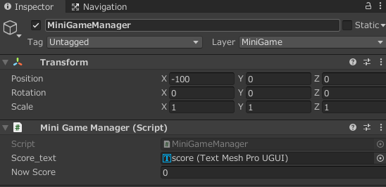 まず、必要なスクリプトを作成し、適切なオブジェクトにアタッチします。以下のスクリプトは、MiniGameManagerというクラスを利用し、ゲーム中にスコアを管理するためのものです。